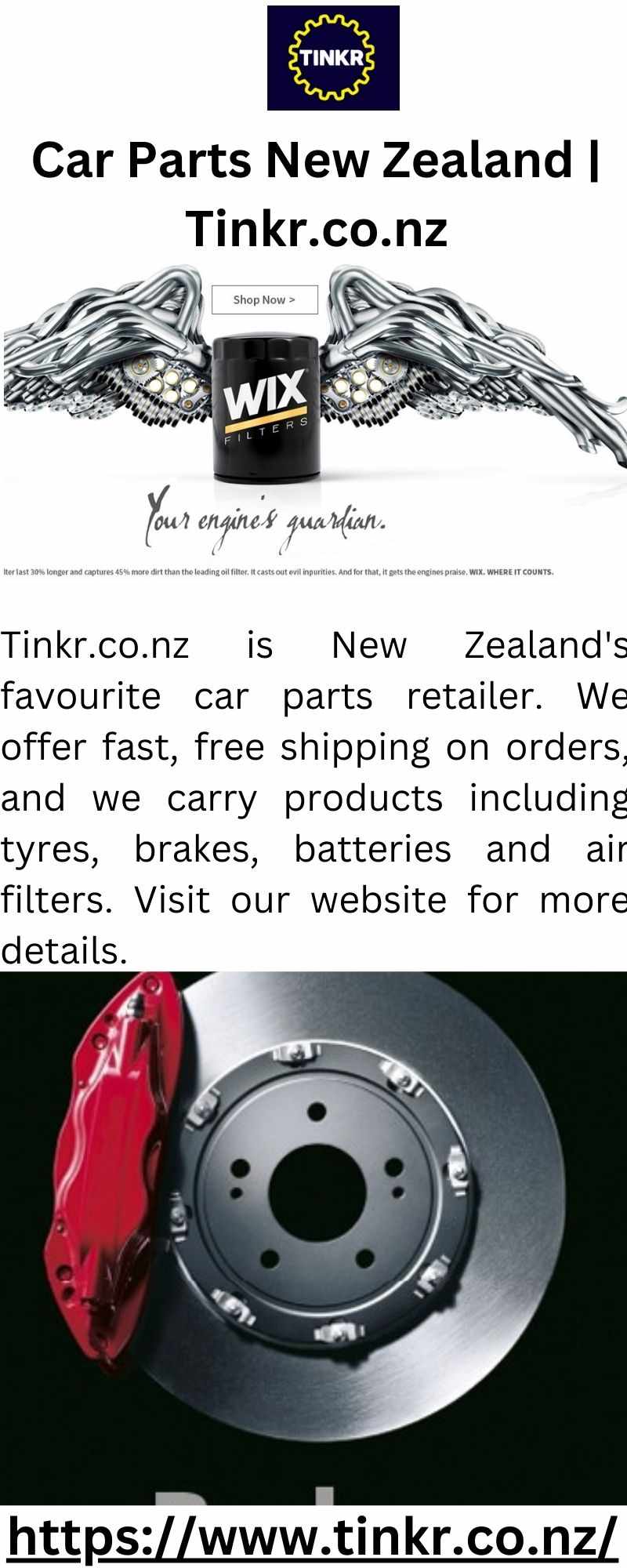 Tinkr.co.nz is New Zealand's favourite car parts retailer. We offer fast, free shipping on orders, and we carry products including tyres, brakes, batteries and air filters. Visit our website for more details.